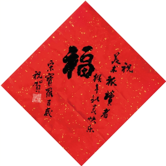 1月24日,风雪之中的杭州冰寒刺骨,书画篆刻样样精通的著名京剧表演艺术家宋宝罗先生在家里用红纸为他钟爱喜读的《美术报》读者写下了朴拙的“福”字以贺即将到来的丙申新春。感谢期颐之寿的老先生,1月16日《美术报》书法版由于编辑的疏忽把他的名字中的“宝”字误作“保”字,他看了后笑笑,一点也不在乎,还对《美术报》赞赏有加,体现了中国老艺术家的胸襟风采——敬祝百岁仁翁健康快乐,再续艺坛佳话!