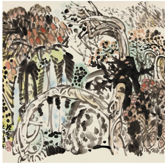 赵经寰 丰饶的秋林 彩墨 66×67cm 1999年