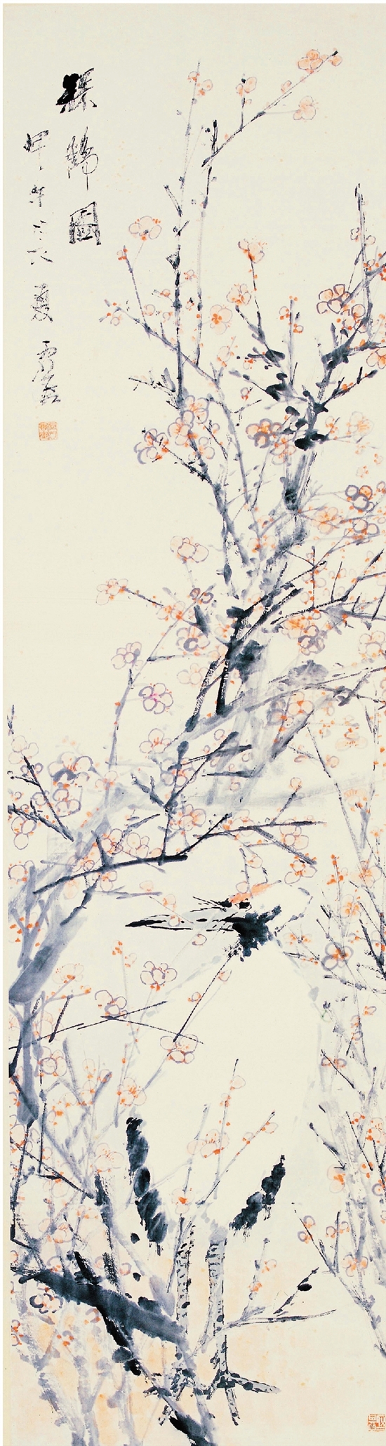 虚谷 梅鹤图 1834年作 纸本设色 179×47cm