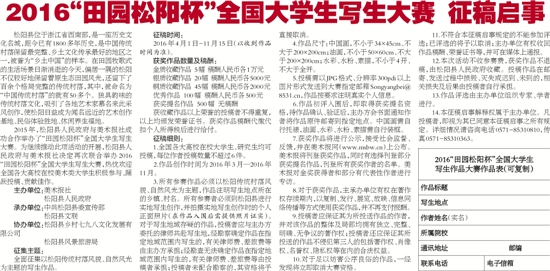 2015年,松阳县人民政府与美术报社成功合作举办了“田园松阳杯”全国大学生写生大赛。为继续推动此项活动的开展,松阳县人民政府与美术报社决定再次联合举办2016“田园松阳杯”全国大学生写生大赛,热忱欢迎全国各大高校在校美术类大学生积极参与、踊跃投稿、贡献佳作。