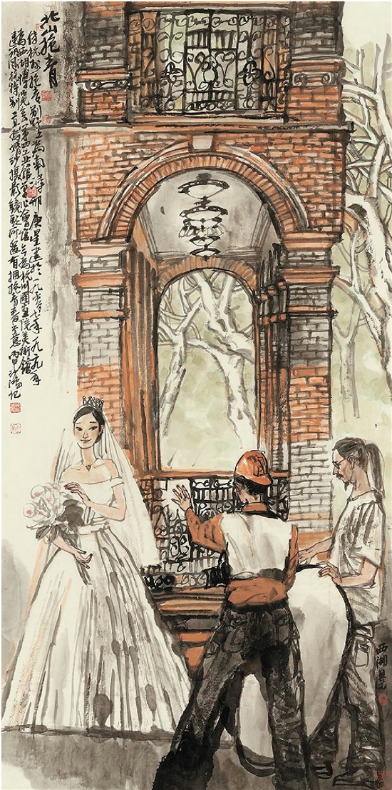池沙鸿 抱青门前拍婚纱照的摄影师 69×137cm