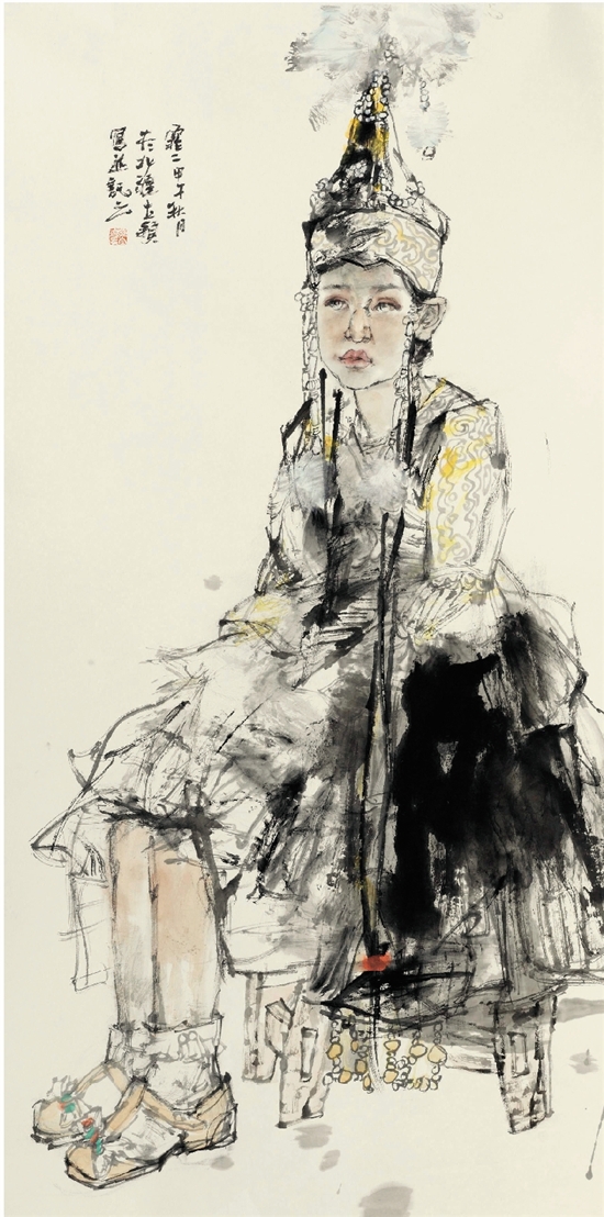 任惠中 哈萨克族姑娘 中国画 136×68cm