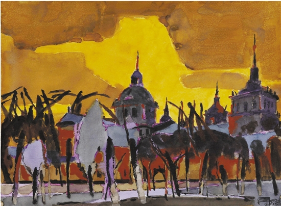 周刚 金色西班牙小镇之冬 水彩画 56×76cm