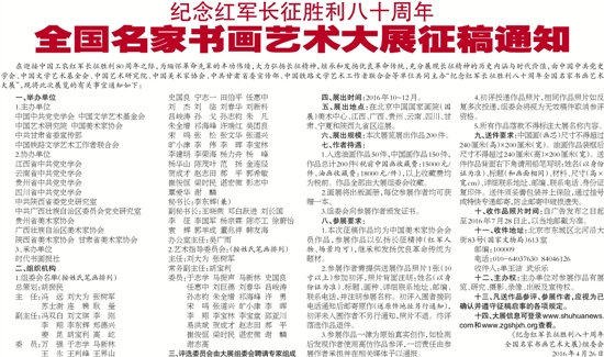 在迎接中国工农红军长征胜利80周年之际,为缅怀革命先辈的丰功伟绩,大力弘扬长征精神,继承和发扬优良革命传统,充分展现长征精神的历史内涵与时代价值,由中国中共党史学会、中国文学艺术基金会、中国艺术研究院、中国美术家协会、中共甘肃省委宣传部、中国铁路文学艺术工作者联合会等单位共同主办“纪念红军长征胜利八十周年全国名家书画艺术大展”,现将此次展览的有关事宜通知如下: