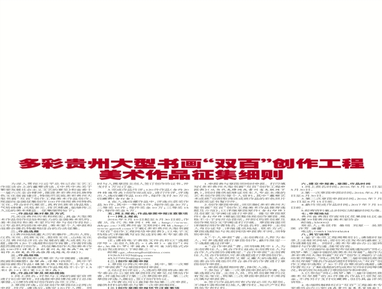 为深入贯彻习近平总书记在文艺工作座谈会上的重要讲话、《中共中央关于繁荣发展社会主义文艺的意见》和省委十一届六次全会精神,推进多彩贵州民族特色文化强省建设,特组织实施多彩贵州大型书画“双百”创作工程美术作品创作。现面向全国征集创作100件体现贵州特色文化,符合时代要求,具有民族史诗品格、气势磅礴、风格多元、技艺精湛,能够传之久远的美术精品。征集细则如下:
