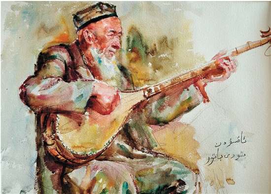 贾忠 弹奏都它尔的老人 65×51cm