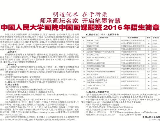 中国人民大学画院秉承“充分发扬国学、国艺”的宗旨,依托中国人民大学雄厚的教育资源和人文社会资源优势,致力于传承、弘扬和发展国学国艺的重任,自2008年开办首届中国人民大学中国画课题班至今已逾8载,聘请中国美术家协会、中国美术家协会河山画会以及国内著名专家、学者,开设以导师或导师组领衔的中国画工作室,涉及中国人物画、山水画、花鸟画和中国书法等领域,培养了1500余名高端书画优秀人才。2016年,经学校批准,中国人民大学画院面向全国继续招收第九届中国画课题班研修生。