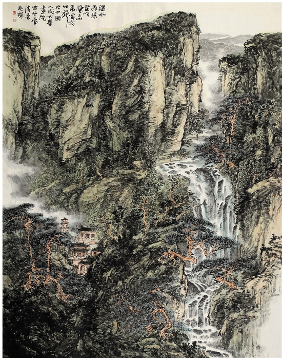 常春辉 瀑水飞珠击峭壁 170×215cm