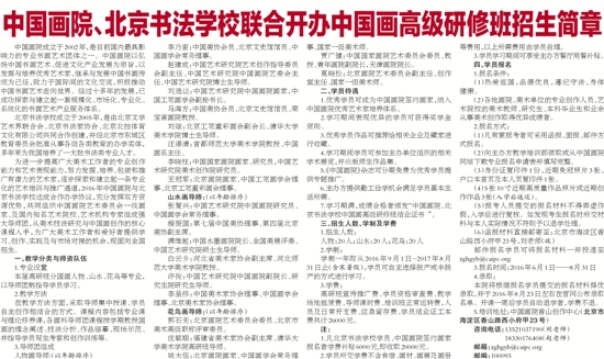 为进一步提高广大美术工作者的专业创作能力和艺术表现能力,努力发掘、培养、包装和推广有潜力的艺术家,逐步探索和建立起一条专业化的艺术培训与推广通道,2016年中国画院与北京书法学校达成合作办学协议,充分发挥双方资源优势,共同组织中国画院艺术委员会一线画家、及国内知名艺术院校、艺术机构专家组成强大导师团,从美术技法研究与中国画创作的核心课程入手,为广大美术工作者和爱好者提供学习、创作、实践及与市场对接的机会,现面向全国招生。