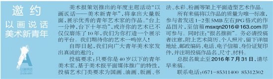 美术报策划推出的年度主题活动“以画说话——美术新青年”,将拿出大量版面,展示优秀的青年艺术家的作品。“台上一分钟,台下十年功”,或许你的艺术已不仅仅磨练了10年,我们为你打造一个展示的平台。我们期待你的艺术一鸣惊人!