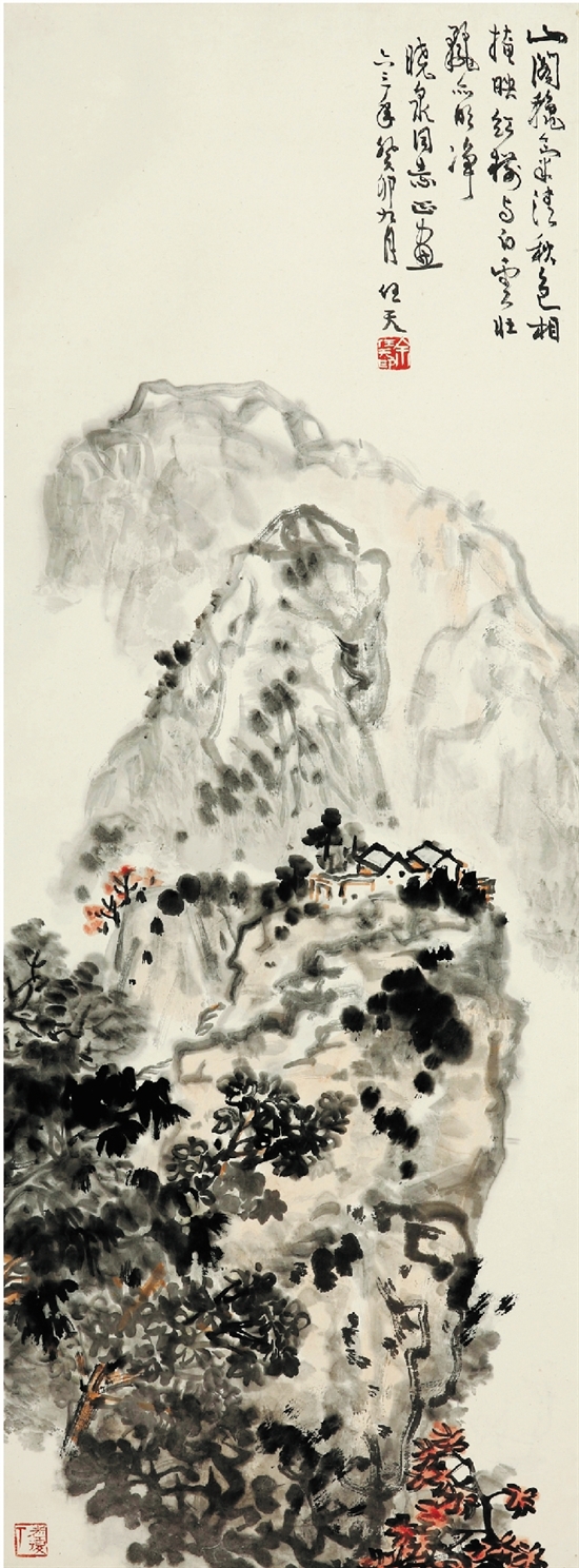 款识:山阁秋气清,秋色相掩映,红梅与白云,壮丽亦明净。晓泉同志正画,六三年癸卯九月,任天。