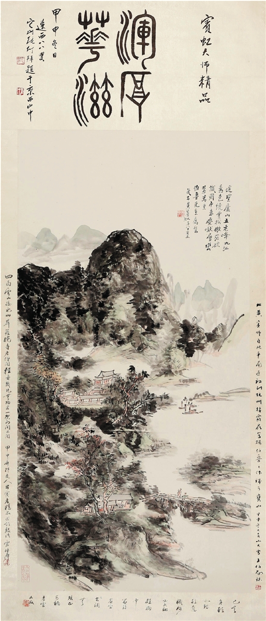 | 款识:遥望庐山五老峰,九江秀色绕云松。微茫欲识图中意,叠巘层峦翠万重。伯鲁先生属粲,戊子黄宾虹年八十有五。钤印:黄宾虹印(白)冰上鸿飞馆(朱) 题跋:1.浑厚华滋。宾虹大师精品。甲申冬日,辽西八八叟它山张仃拜题于京西山中。钤印:张仃(白)它洞(朱) 2.此黄宾师自北平南返,初到杭州栖霞岭,写赠伯鲁之作,诚可宝也。甲申冬,大奇山大雪,王伯敏志。钤印:王伯敏印(白) 3.已是身形北鹤形,息机何必更翻经。胸中留得虚空在,古调无弦正可听。老卢又及。钤印:坤峰(白) 4.四面云山接水山,薜萝绕寺老僧闲。轻舟几片无归客,一架木门开又关。甲申年终,友人出宾老精品,因题数语。卢坤峰。钤印:卢氏(朱) |