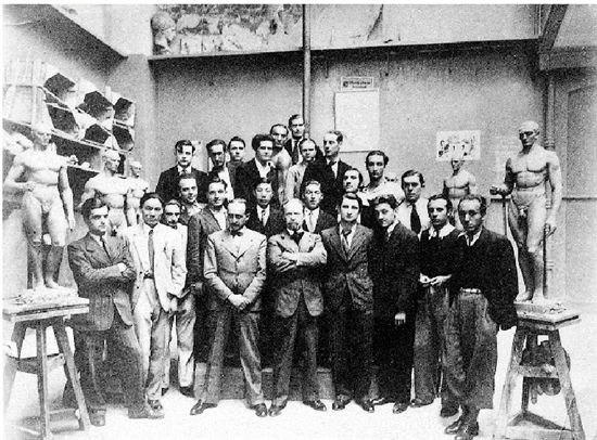 1931年王子云与巴黎高级美术学校雕塑班师生合影(图中抱臂于胸者为其老师朗多维斯基 前排左二人为王子云)