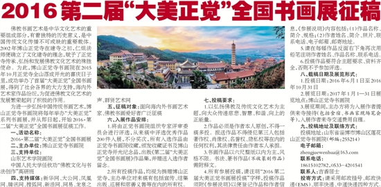 为进一步弘扬中国传统书画艺术,博山正觉寺书画院将每年举办“大美正觉”系列书画展,并从即日起,开始2016·第二届“大美正觉”全国书画展征稿工作。
