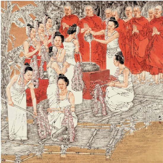 郭大川 澜沧江畔取圣水 纸本 180×180cm 2014年