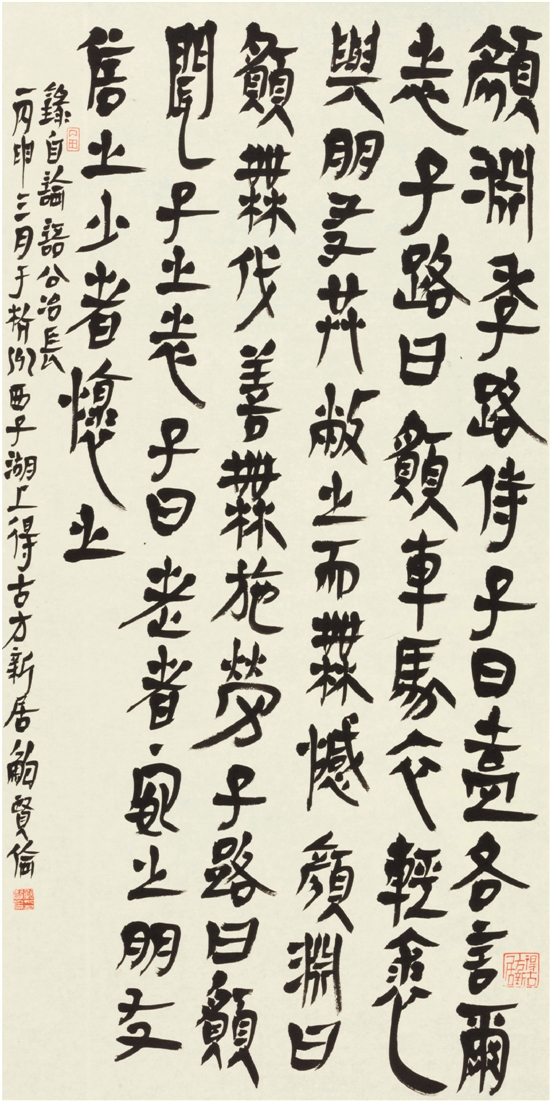 漫步展厅,人们看到的鲍贤伦书法无疑是独特的——或肃穆正大,或厚重古朴,既合于古,亦适于今。其个性建立在对书法本体的独特领会和对书法史迹独到解读的基础上。如果用一个字来表述其书作的特征,无疑“古”字足当之。从书体的角度来说,鲍贤伦以汉隶作基,由汉入秦,以古隶为乡,完成了成功跨越。他对时代的反思,正反映在他对诗心时代的回归中。