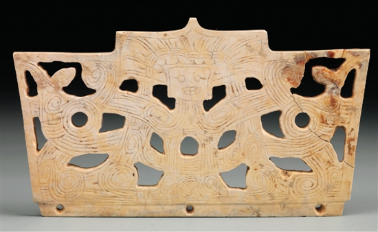 | ▲镂空神人纹玉冠状器 良渚博物院藏 1986年浙江省杭州市余杭区瓶窑镇反山遗址M15出土 玉冠状器为良渚文化时期带有礼仪性质的装饰玉器。该器物平面整体呈宝盖头结构,如同良渚文化晚期的台阶形玉片的结构,冠顶中部切割呈宝盖头结构,下端扁榫上有三个等距的对钻小孔。正反两面以透雕和阴线刻划相结合的技法,对称雕琢肢体俱全的神人图像,填刻光芒线的宝盖头冠帽,倒梯形脸部,单圈眼,一侧刻划眼角,刻划有牙齿的宽嘴。神人上臂两侧各“持”有鸟形象,此部位纹饰或可视为兽面纹的双眼,神人胸腹部位为一般常见的圆拱形结构。两面的纹饰除个别刻划线条的结构有区别外,余均一致。 |