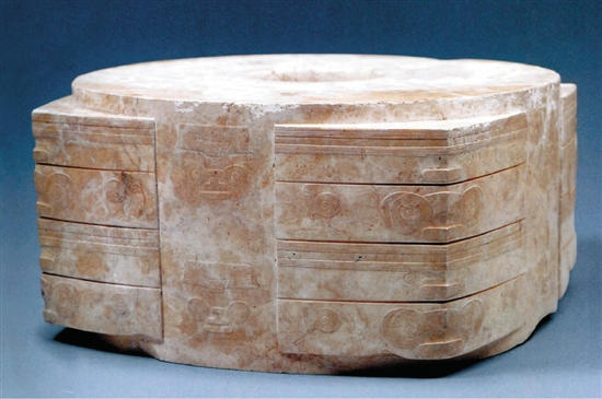 | ◀玉琮 浙江省博物馆藏 1986年浙江省杭州市余杭区瓶窑镇反山遗址M12出土 该件玉琮重约6500克,形体宽阔硕大,纹饰独特繁缛,为良渚文化玉琮之首,堪称“琮王”。器型外圆内方,上大下小,中间对钻圆孔。琮体四面直槽内上下各琢刻神人兽面图像,整体图案采用浅浮雕和线刻技法雕琢而成。在呈角尺形的长方形凸面上,每两节琢刻一组象征性的神人兽面图案,以转角为中轴线向两侧展开,兽面的两侧还各浅浮雕一变形夸张的鸟纹。玉琮,是良渚文明特有的礼仪重器。它的工艺技术代表了5000年前玉器制作的最高水平;它所体现的用玉制度,揭示了礼仪制度的建立形成,对中国后世“礼制”文化的发展完善产生了深远影响。特别是上面的神人兽面图案,是具有共同信仰的原始宗教重要标志。 |