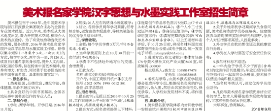 美术报创刊于1993年,是中国美术学院与浙江日报报业集团联合主办的全国性专业美术报纸。近几年来,美术报从大美术角度出发,着力开拓美术空间、积极介入美术热点宣传。为了有效地推动当代艺术的发展,服务读者,2016年美术报名家学院开设汉字思想与水墨实践工作室。研修以集中短训(一年集中3次,一次20天)的方式,每学年3次,两年为一届,共120天。该项目注重名家贴身示范,提升人文内涵,深化理论修养,旨在传承中国艺术精神,培养有潜力、有实力、同时勇于社会担当的未来中国书画名家。具体招生事宜如下: