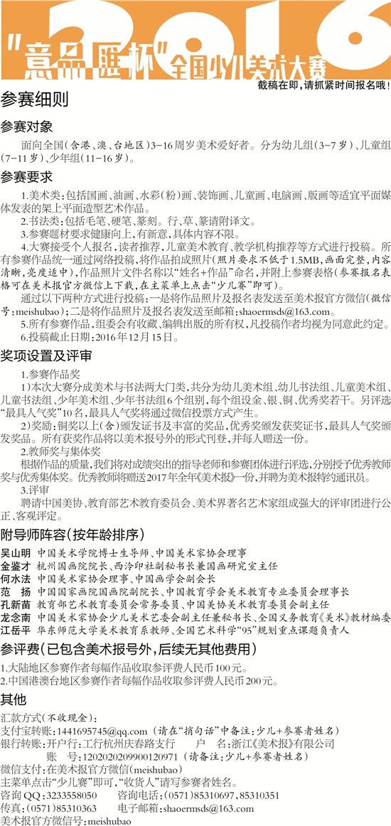 银行转账:开户行:工行杭州庆春路支行 户 名:浙江《美术报》有限公司