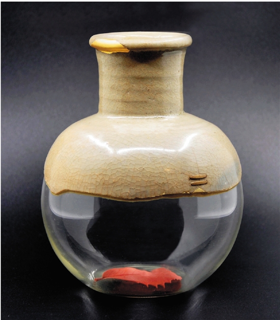 《嫁接》宋青瓷残件 玻璃、天然生漆、瓦灰、金箔、铜锔钉 直径136高163