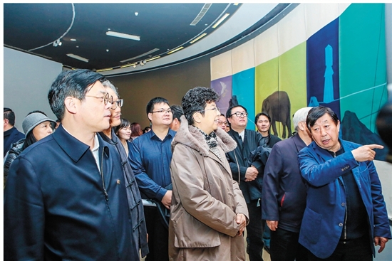 中国文联党组书记、副主席、书记处书记赵实,中国美术家协会主席刘大为(右一),中国美术家协会分党组书记、中国美术家协会驻会副主席、秘书长徐里(左一),中国工笔画学会常务副会长兼秘书长萧玉田等人在展览现场