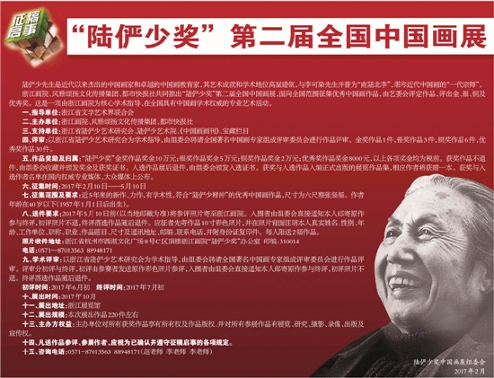 浙江画院、风雅颂扬文化传播集团、都市快报社共同推出“陆俨少奖”第二届全国中国画展,面向全国范围征集优秀中国画作品,由艺委会评定作品,评出金、银、铜及优秀奖。这是一项由浙江画院为核心学术指导、在全国具有中国画学术权威的专业艺术活动。