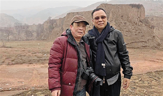 ◀邵璞(右)与段铁(左)在中国文联、中国美协举办的“中国精神·中国梦”美丽乡村行——陇西写生途中