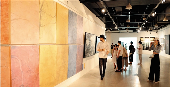 6月9日,观众在西安美术学院2017届本科毕业生作品展上参观油画作品。(新华社记者 邵瑞/摄)