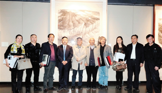 天津山水画专业委员会会长姬俊尧、纪振民、刘向东、卞昭宏、王昕、杨利民、曲卫东、王大成、于淑梅等与吕大江合影于展厅。
