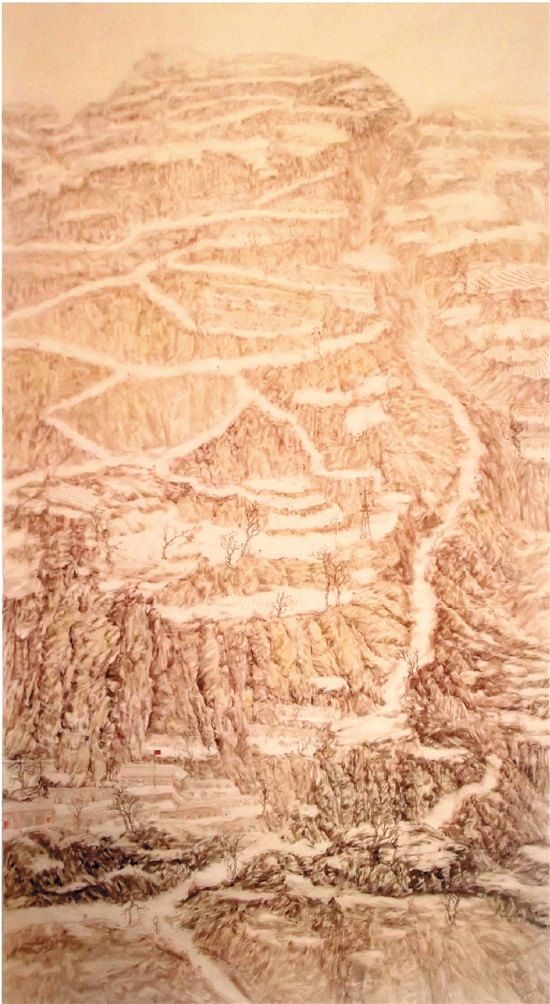 | 王玉保 峥嵘岁月展新颜 国画 ◎点评:这幅作品以温馨的色调取胜,在构图上用黄土高坡上的山路组成了纵横交错的“线”,富有较强的形式感,与传统手法拉开了距离,所以有了一定的创新意味。当然如果在近景处有适当深入的刻画,拉开空间距离,那么会更丰富和耐看。 |
