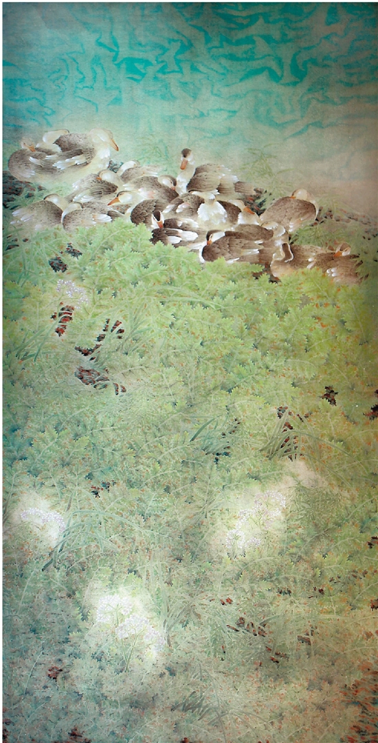 ◎点评:工笔花鸟画这些年来取得了长足的进步。这幅作品,在色彩的把握与制作上都可圈可点。画面上休闲大雁实写与野草的虚写,对比效果与气氛渲染都不错。如果在画面大的对比上再强调一些,那么作品的精神会更好。
