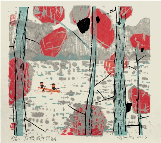 方利民 万顷波中得自由 20×22cm 水印木刻 2013年
