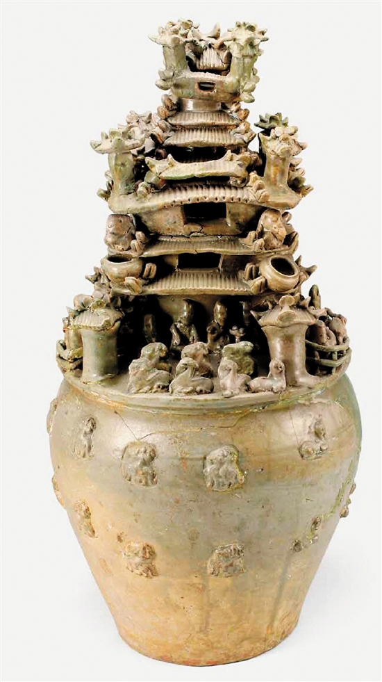越窑青瓷楼台百戏堆塑罐