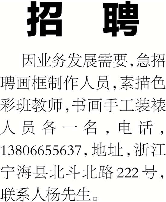 因业务发展需要,急招聘画框制作人员,素描色彩班教师,书画手工装裱人员各一名,电话,13806655637,地址,浙江宁海县北斗北路222号,联系人杨先生。