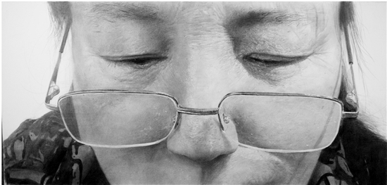 曲怀治 中年妇女-花镜 90×120cm 纸本 铅笔 2015年