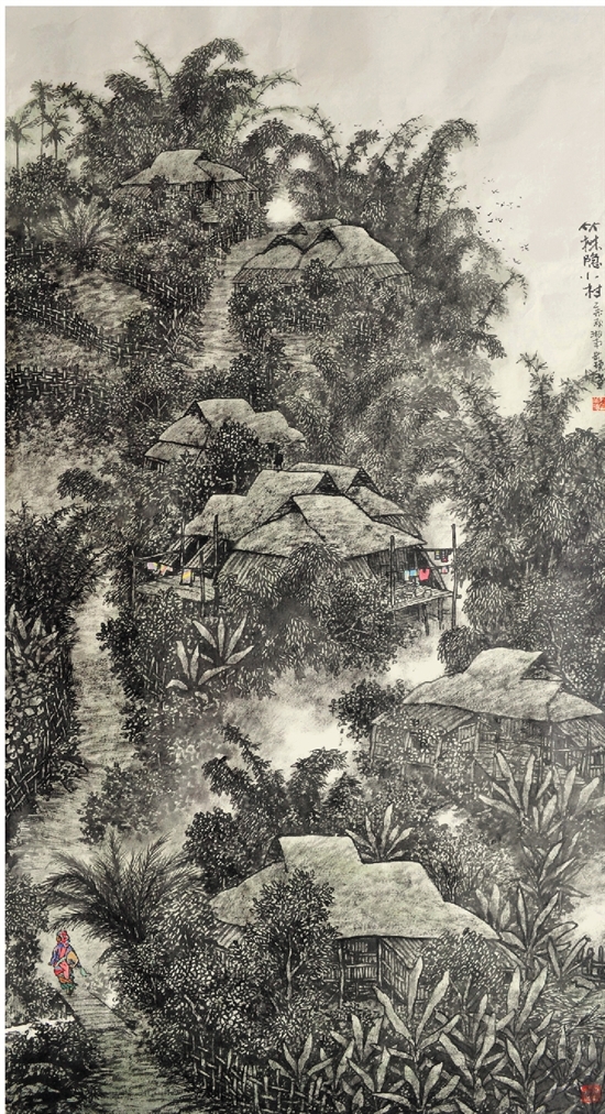 刘岳琥 竹林隐小村 180×97cm 中国画