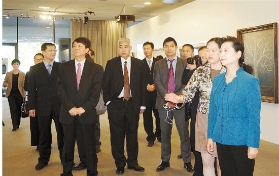 中宣部副部长崔玉英(右一)等领导在陶勤副秘书长(右二)陪同下参观在芬兰的展览