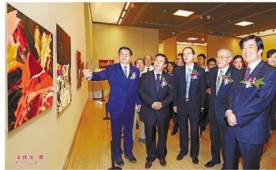 徐里驻会副主席(左一)向中外嘉宾介绍双年展作品