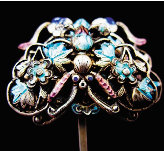 清代 京工双层镂空烧蓝蝶恋花簪子