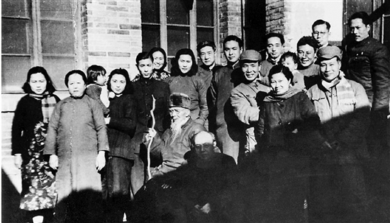 1950年,在大雅宝胡同甲2号庆祝白石老人90岁寿诞时合影,前排从左至右为:齐白石、李苦禅、李可染(抱女儿李珠)、邹佩珠(李可染夫人),滑田友;后排从左二起至右依次为:解驭珍之母(王朝闻岳母)、李慧文(李苦禅夫人)及女儿李琳、齐良迟(齐白石四子)、范志超、廖静文、徐悲鸿、齐良巳(齐白石五子)、王朝闻、滑田友之弟、李瑞年、叶浅予