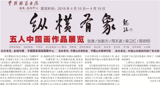 “纵横有象”五人中国画作品展,是来自中国山水画创作院广东(顺德)分院的文化干部,利用业余时间创作的作品晋京展。张旗传承家学,其父张介先生十几年前就在中国美术馆举办过个人画展;张新杰自学成材,胸中的山水,气势浩大巍峨绵延;周本波在传统笔墨与岭南水乡具体景致的结合上寻求突破;梁卫红求学于中国艺术研究院,用细致笔触表现大山大岭的山水趣味;陈安明在京城以古为师与贤人为伍将近十年,能正确的把握中国山水画的造型和笔墨的规律。