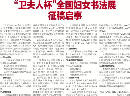 4.书法作品来稿时请勿托裱或用胶膜复背,草书、篆书需附释文,请在信封上注明“卫夫人杯”字样。