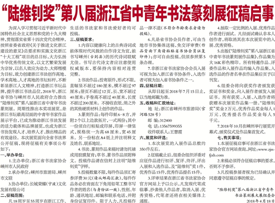 为深入学习贯彻习近平新时代中国特色社会主义思想和党的十九大精神,贯彻落实省第十四次党代会精神,按照省委省政府《关于推进文化浙江建设的意见》总要求和实施文化浙江“十大工程”项目的总目标,大力弘扬中华优秀传统文化,以文艺繁荣发展为宗旨,以名人效应为动力、大师楷模为目标,致力创建浙江书法创作高地、学术高地、人才高地的书坛标杆,不断彰显浙江人文精神,打造浙江书坛品牌,提升浙江书法品位,2018年,浙江省书协与嵊州市人民政府合力推出“陆维钊奖”第八届浙江省中青年书法篆刻展。周期性推出本奖项展览,是浙江书坛最高层面的中青年书家作品展示平台,已成为推动浙江书法发展的活力载体和品牌展览,也成为浙江书协发现人才、培养人才、推出精品的有效途径。本次展览面向全省书法界公开征稿,现将征稿有关事项公布如下: