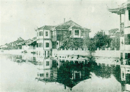 罗苑全景图(1930年),中间两层建筑物的二楼为当时图书馆的所在。
