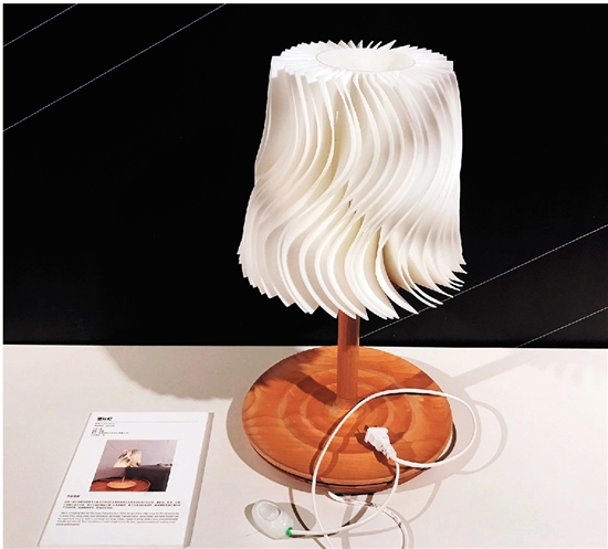 这是一款以旋转的裙摆为元素设计的台灯。主要的特点为其波浪形的片状灯页,便于拆卸、组装和运输。灯罩和灯座可分离,便于灯泡的换取。灯座由木材制作,使其看上去更加环保。底座模拟水滴入湖中所产生的涟漪,金属触摸按钮增添了时尚感。