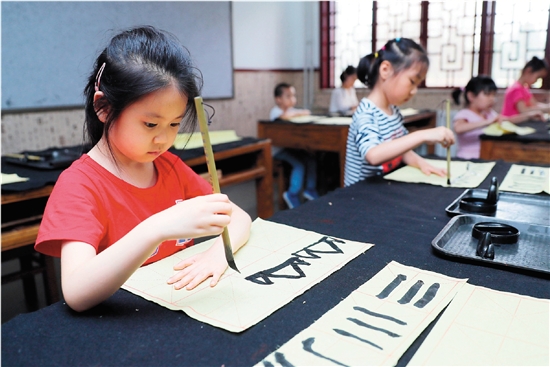北京,2018年5月17日,孩子们在幼小衔接课堂上学习书法 张玉薇/摄(新华社照片)