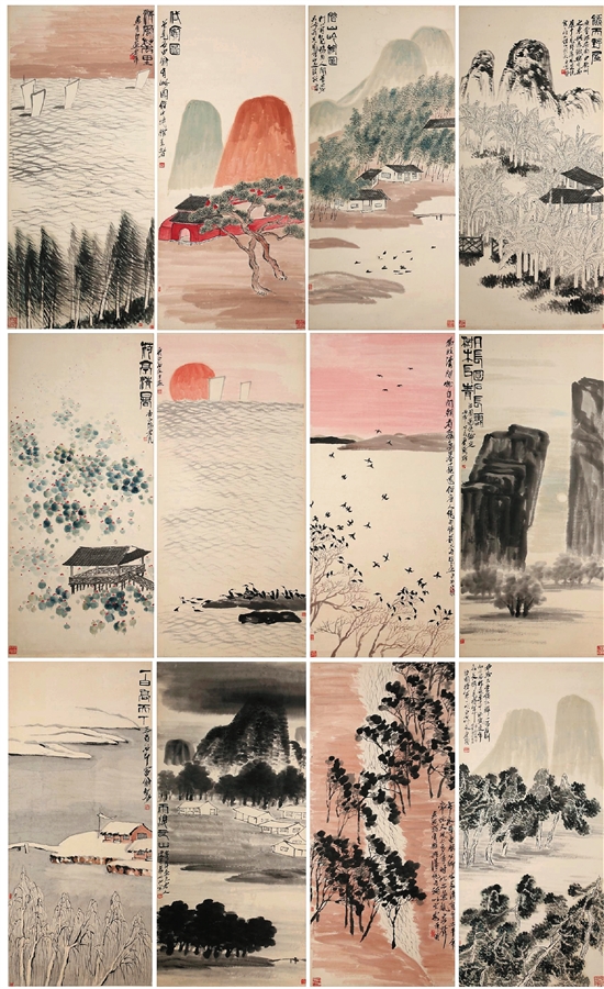 齐白石 四季山水十二条屏 138×62cm 纸本设色 1932年 重庆中国三峡博物馆藏
