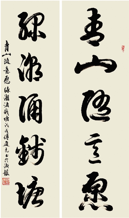 傅通先 草书 青山绿潮五言联