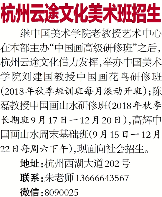 继中国美术学院老教授艺术中心在本部主办“中国画高级研修班”之后,杭州云途文化借力发挥,举办中国美术学院刘建国教授中国画花鸟研修班(2018年秋季短训班每月滚动开班);陈磊教授中国画山水研修班(2018年秋季长期班9月17日一12月20日),高辉中国画山水周末基础班(9月15日一12月22日每周六下午),现面向社会招生。